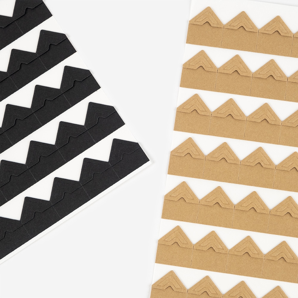 Cada embalagem traz 252 cantos adesivos. Disponíveis em preto ou craft, são autocolantes, fáceis de aplicar e adaptam-se a vários tamanhos de fotografia. Ideais para dar um toque especial aos teus projetos de scrapbooking.
